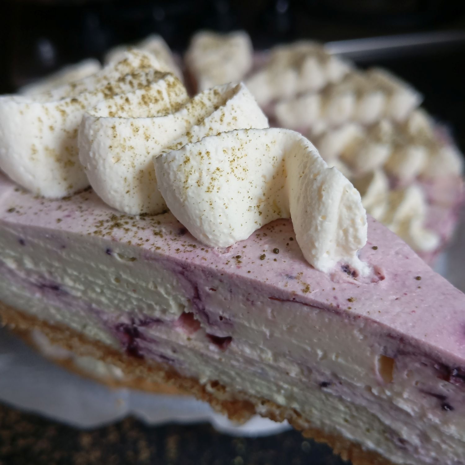 Een perfecte, gedurfde, smaak combinatie van gemberkoekjesbodem met een mix van cheesecake deels met matcha en zwarte bessenjam ertussendoor, gedecoreerd met slagroom