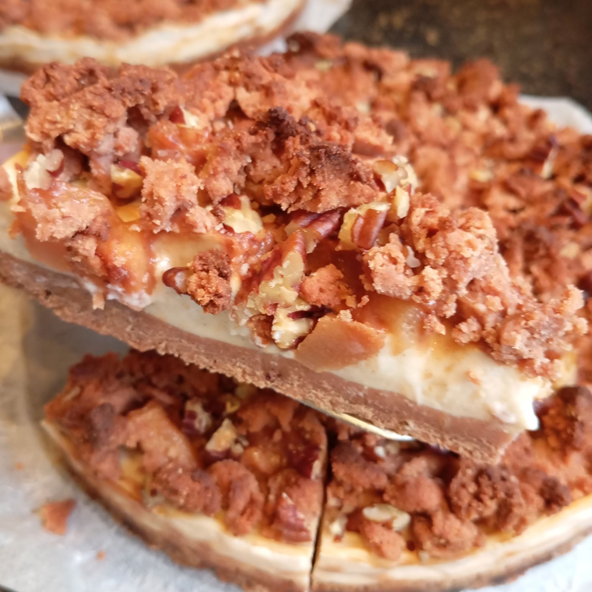Een licht gezoet taartje met speculaas- bodem, zachte "cheesecake" laag met er bovenop zachte peer met speculaas crumble en pecannootjes. Gezoet met agave.